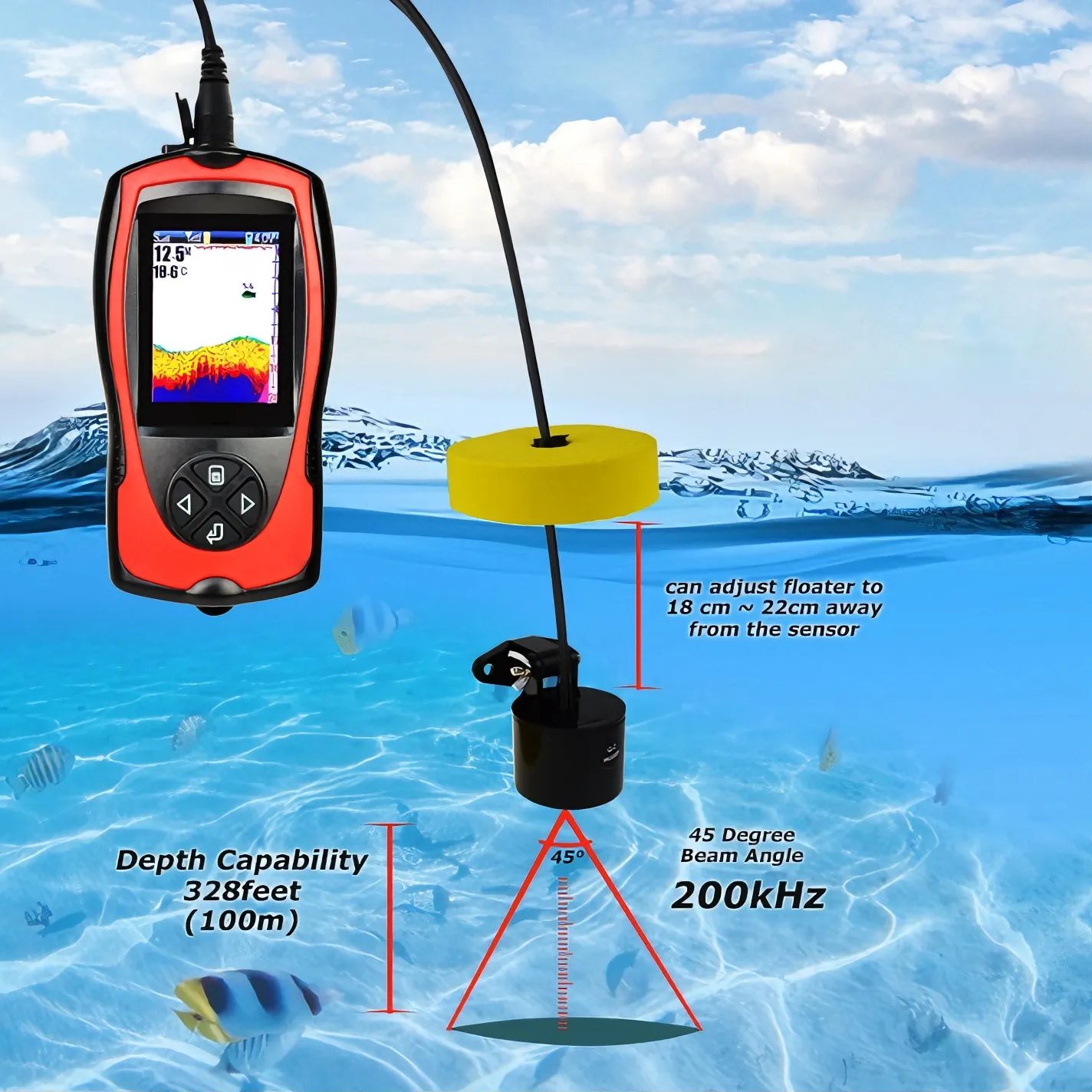 With an adjustable floater distance of 18–22 cm from the sensor, this system ensures stable positioning for precise readings. It offers an impressive 328 ft (100 m) depth capability, allowing you to explore deeper underwater environments with confidence. The 45° beam angle combined with a 200 kHz sonar frequency delivers reliable, focused scanning for clear detection of underwater structures, fish targets, and depth changes. Perfect for anglers seeking accurate and consistent performance in various fishing conditions.