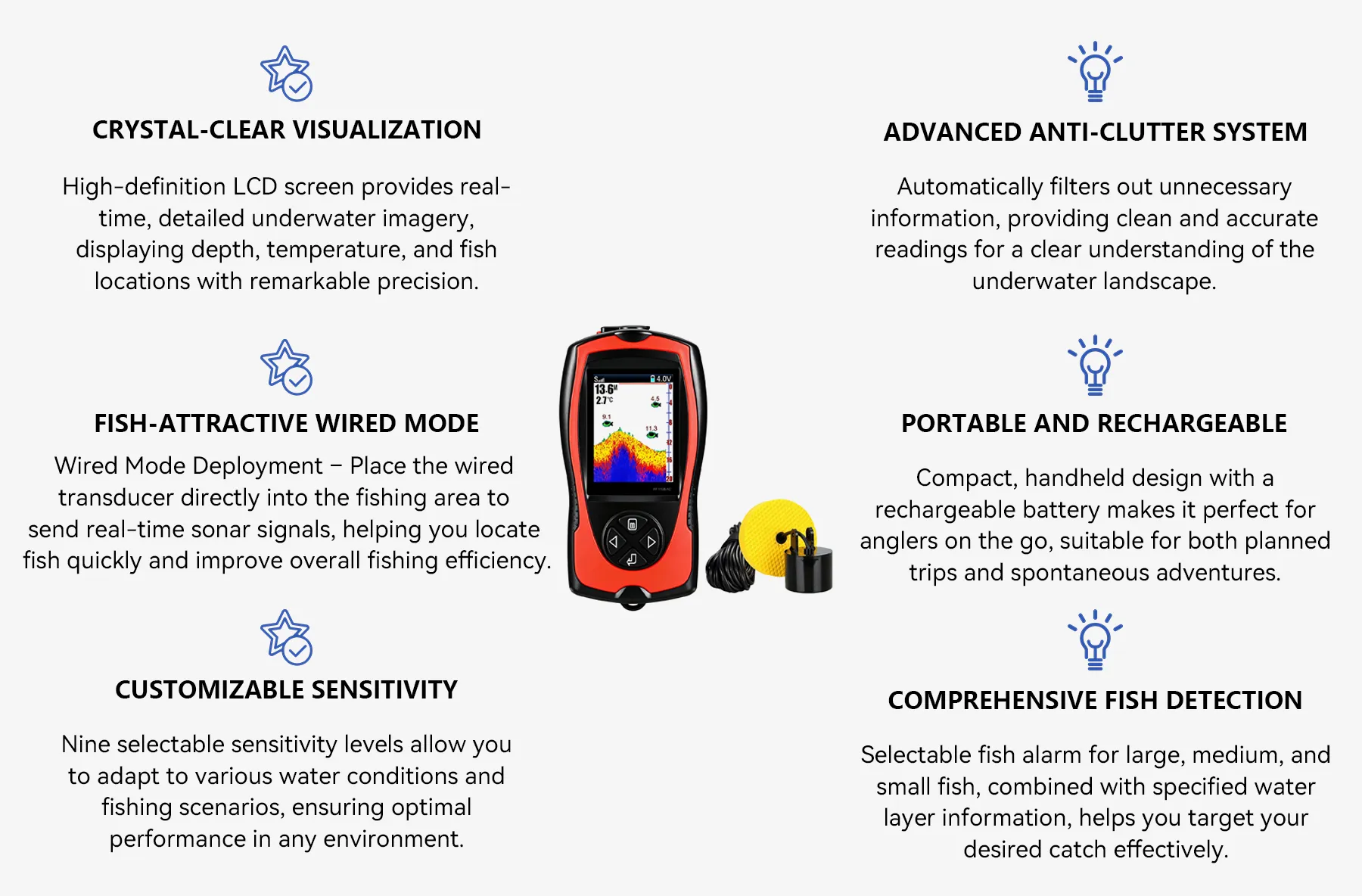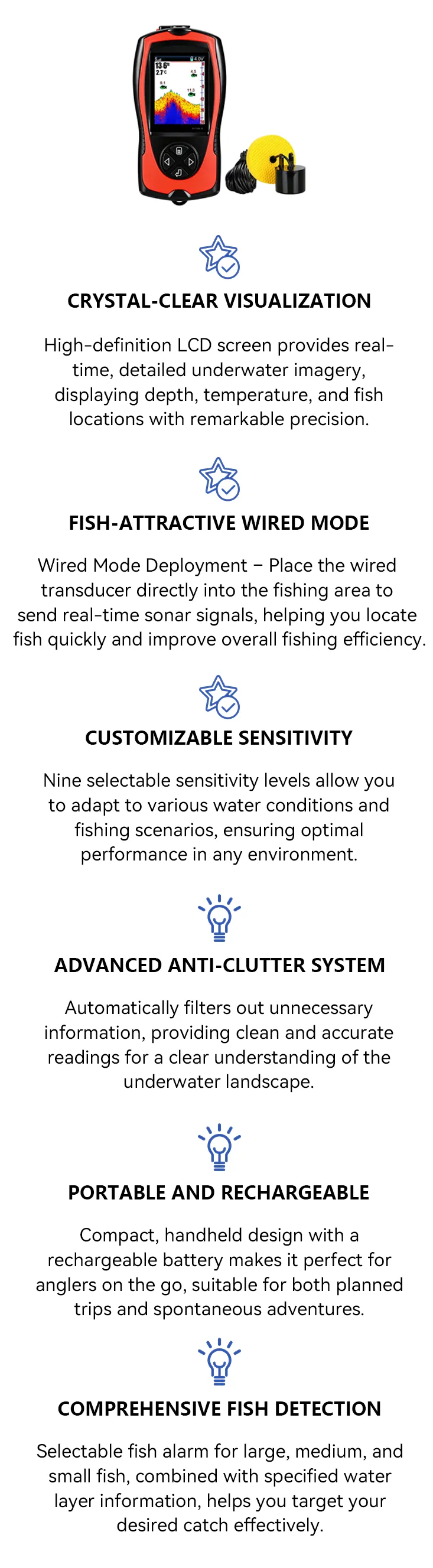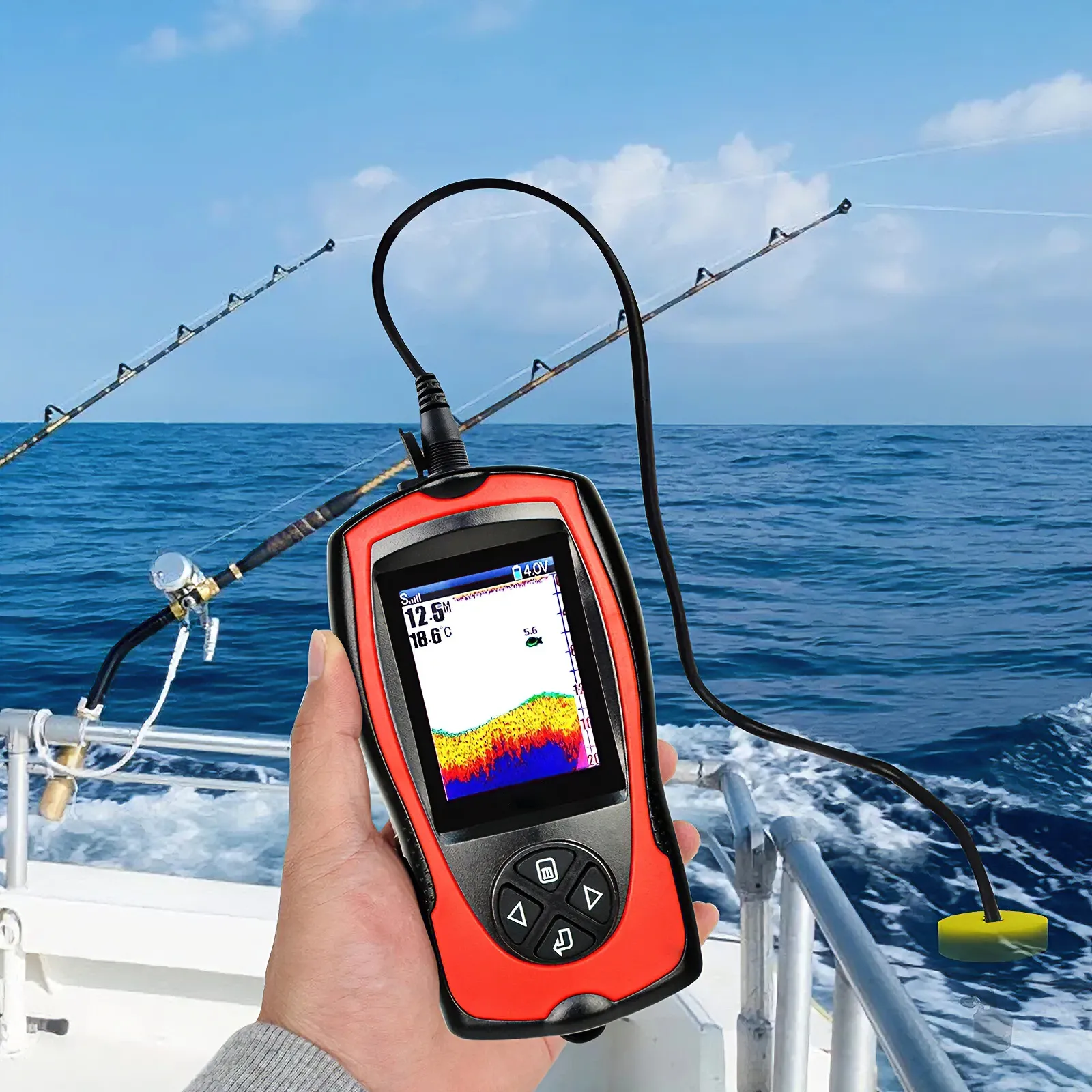 - Crystal-Clear Visualization – HD LCD screen shows real-time depth, temperature, and fish locations.