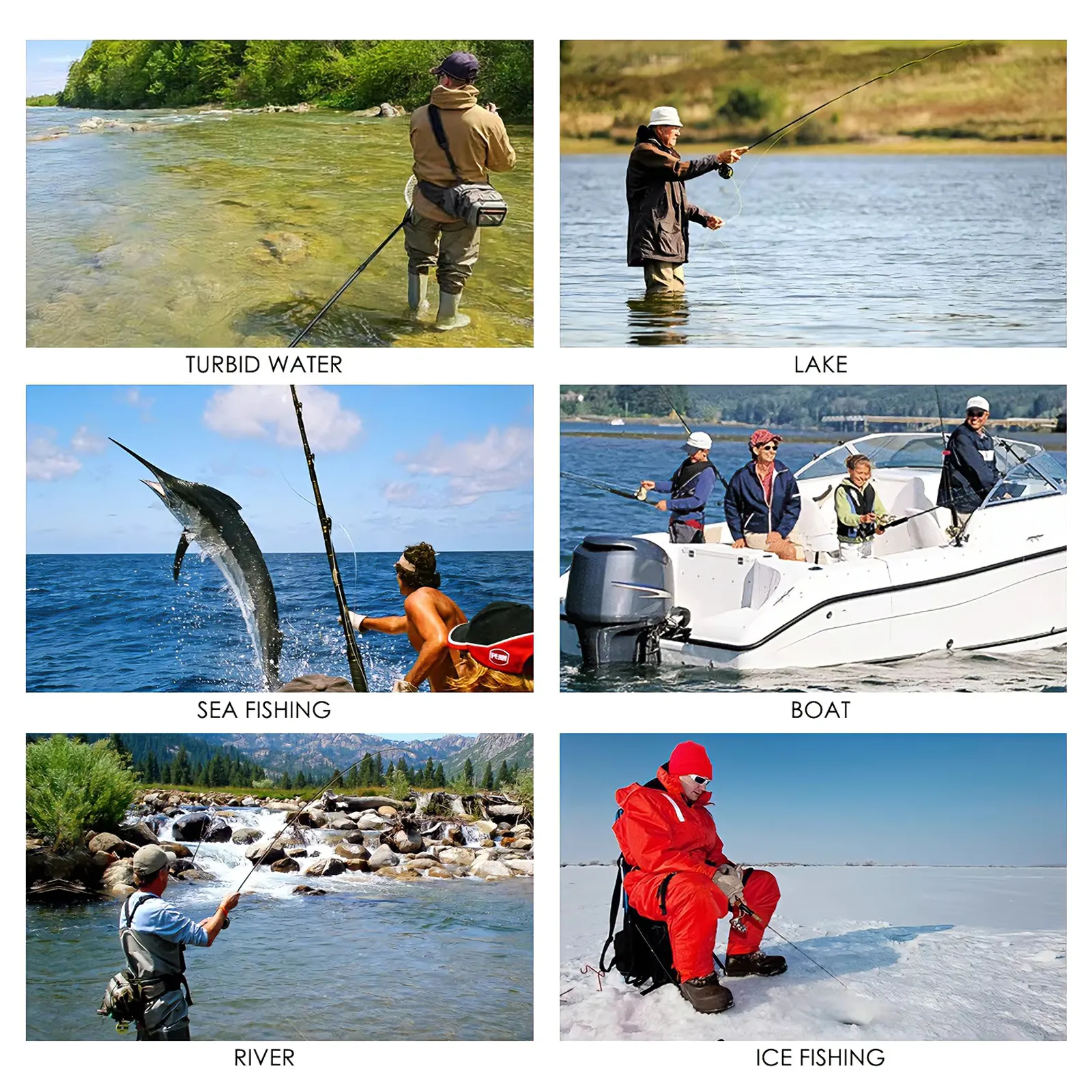 The Revora Portable Fish Finder is engineered for versatile use across a wide range of environments. Whether you're fishing in turbid water, exploring the sea, casting in a river or lake, operating from a boat, or enjoying ice fishing, it delivers reliable detection and clear readings in every scenario. Built to adapt to different water depths and conditions, it ensures consistent performance wherever your fishing adventure takes you.